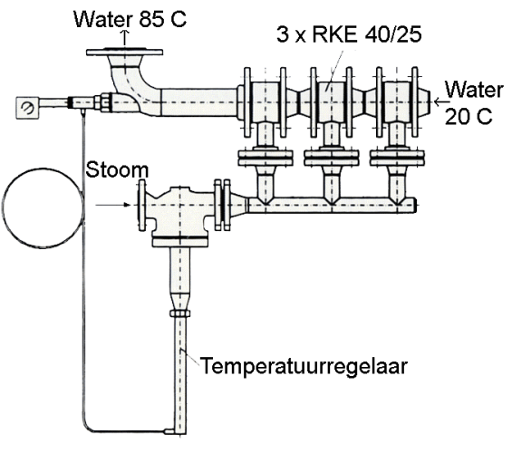 Our steam injectors can also be mounted in a tank to heat water or other liquids. The temperature of the medium to be heated increases very evenly and the medium cannot burn. The injected hot steam heats the liquid in the tank directly, while mixing it at the same time, resulting in a good homogenisation of the medium.