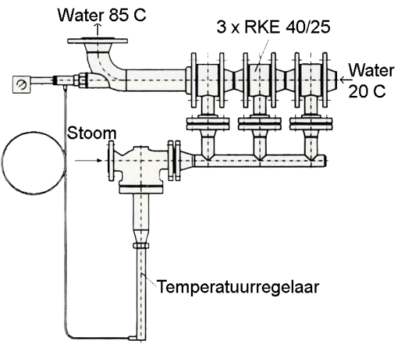 Water with a flow rate of 6000 litres/h is heated from 20 °C to 90 °C by 3 interconnected steam injectors of type RKE 40/25 with a steam capacity of 3x280 kg/h = 840 kg/h. When multiple injectors are used, water can be heated